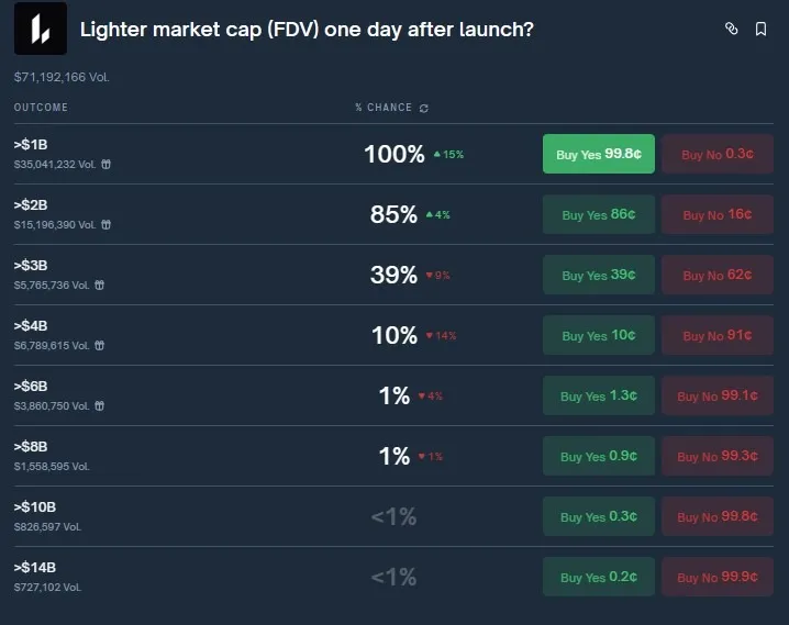 围绕LIT发行的投机热潮迅速蔓延至预测市场Polymarket,交易员们在该平台上投入超过7000万美元,押注LIT在发行后一天的完全稀释估值(FDV)将达到何种水平。