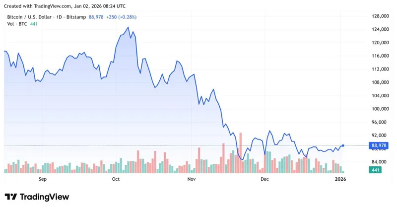 在2026年首个交易日,比特币在88,000美元附近震荡,市场因假期影响,交易量较低,价格波动受限。
