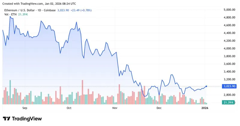 与此同时,以太坊目前交易价格约为3,024美元,显示出在经历多月急剧下滑后,初步稳定的迹象。图表显示,自9月高点超过4,500美元以来,出现明显下行趋势,11月的急剧下滑后,12月的反弹尝试也颇为波动。以太坊最近从接近2,800美元的低点反弹,但上涨动能依然不稳。