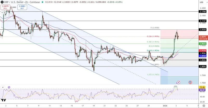 #XRP突破了12月的下行趋势,保持在2.01附近。EMA向上,RSI在强势后回落,结构有利于继续上涨。突破2.00后,2.13–2.20成为关注焦点。 pic.twitter.com/I9uvNgSnyi