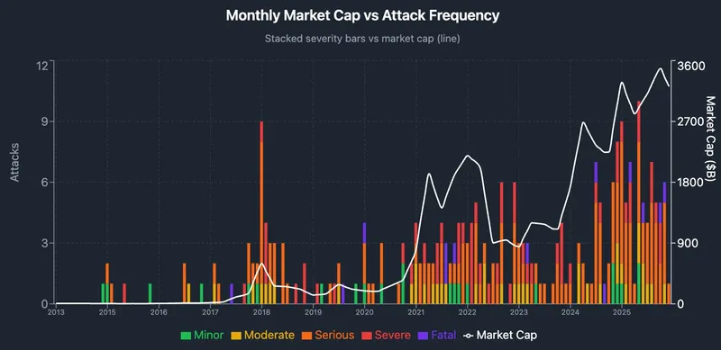 价格是一个明显的驱动因素。分析表明,暴力事件的发生频率与加密货币总市值呈正相关。简单回归分析显示,约45%的攻击频率变化可以通过市值因素解释,这支持了价格上涨会吸引更多犯罪活动的观点。