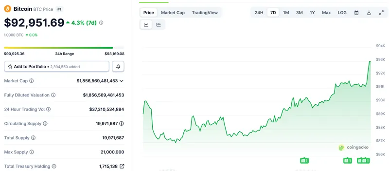 根据CoinGecko的数据,自委内瑞拉军事行动以来,比特币(BTC)已从8.999万美元上涨3.35%至9.3万美元。