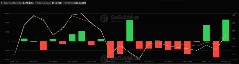 2026年首个交易日,即1月2日,美国比特币现货交易所交易基金(ETF)录得正流入,金额为4.71亿美元,累计净流入达到570.8亿美元。