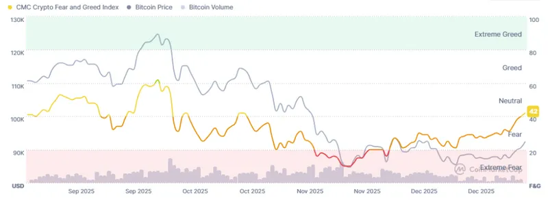 当前加密恐惧与贪婪指数为42,相较于过去一个月的最低点21,首次回归中性区间。