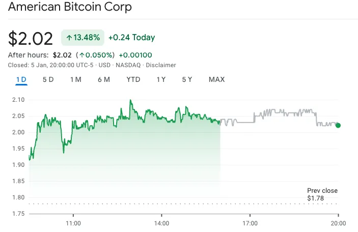 加密矿业公司股价也同步上扬,由小唐纳德·特朗普和埃里克·特朗普担任高管的美国比特币(ABTC)上涨13.5%,收于2美元以上,首次突破该关口近一个月。