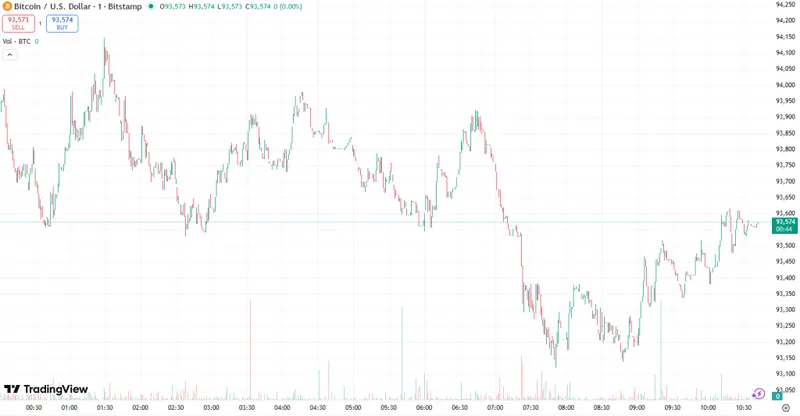 截至周二早晨,比特币价格为93,583美元。从日内低点92,474美元反弹至高点94,634美元,价格相对稳定。