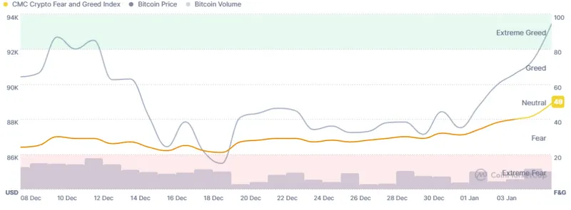 加密恐惧与贪婪指数今天为49,相比昨日的42和本月初的21有所回升,首次脱离恐惧区间,自2025年10月以来首次出现。