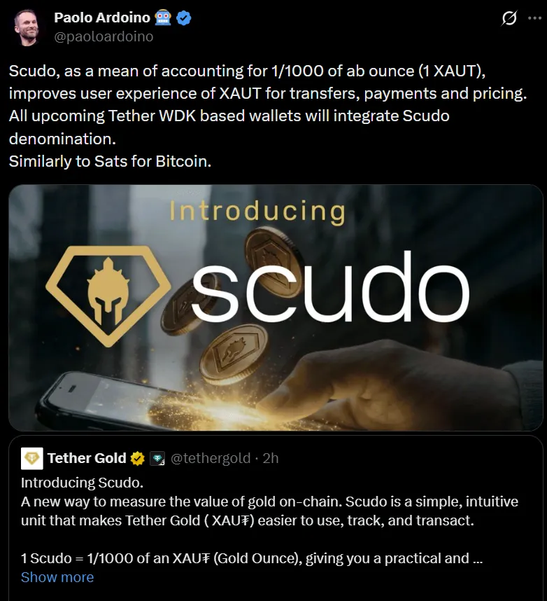 虽然XAUT通过将实物黄金代币化解决了许多挑战,但Scudo旨在进一步简化小额链上交易。