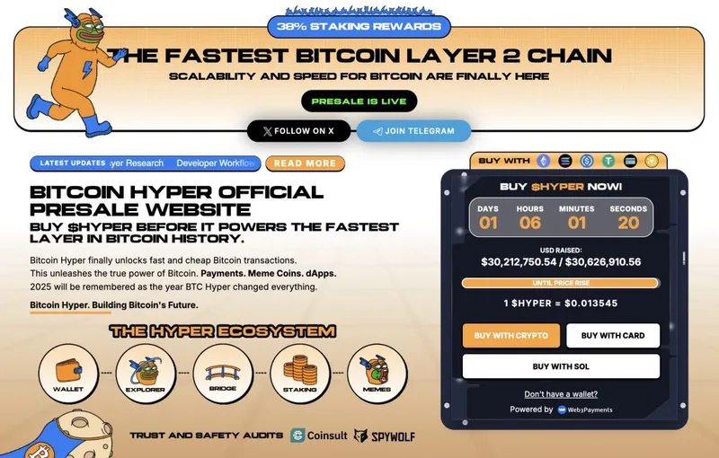 随着对Solana生态系统的兴趣不断上升,像比特币Hyper($HYPER)这样的顶级加密预售项目也可能吸引华尔街的关注。这是一个基于Solana的比特币二层解决方案,将使BTC投资者更容易获得被动收入。