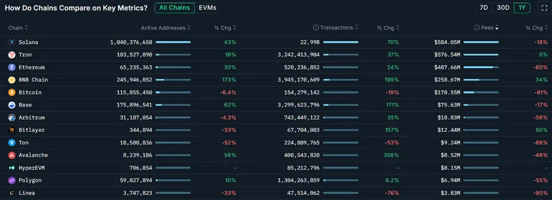 根据加密情报平台Nansen的数据,过去一年,Solana区块链以5.85亿美元的手续费收入位居首位,Tron以5.76亿美元紧随其后。