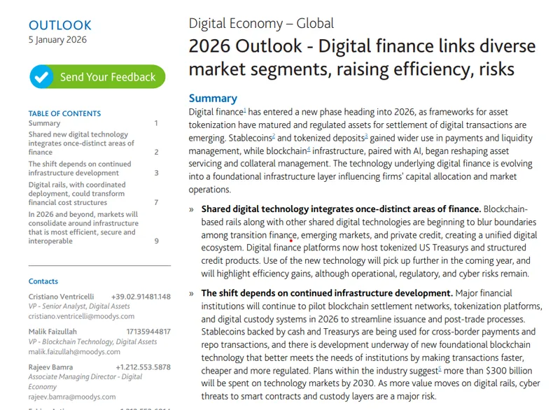 穆迪同时强调,行业转型并非没有风险。随着更多价值迁移至“数字基础设施”,报告警告称,智能合约漏洞、预言机失效、托管系统遭受网络攻击,以及多条区块链间的割裂,可能导致新型运营及对手方风险。