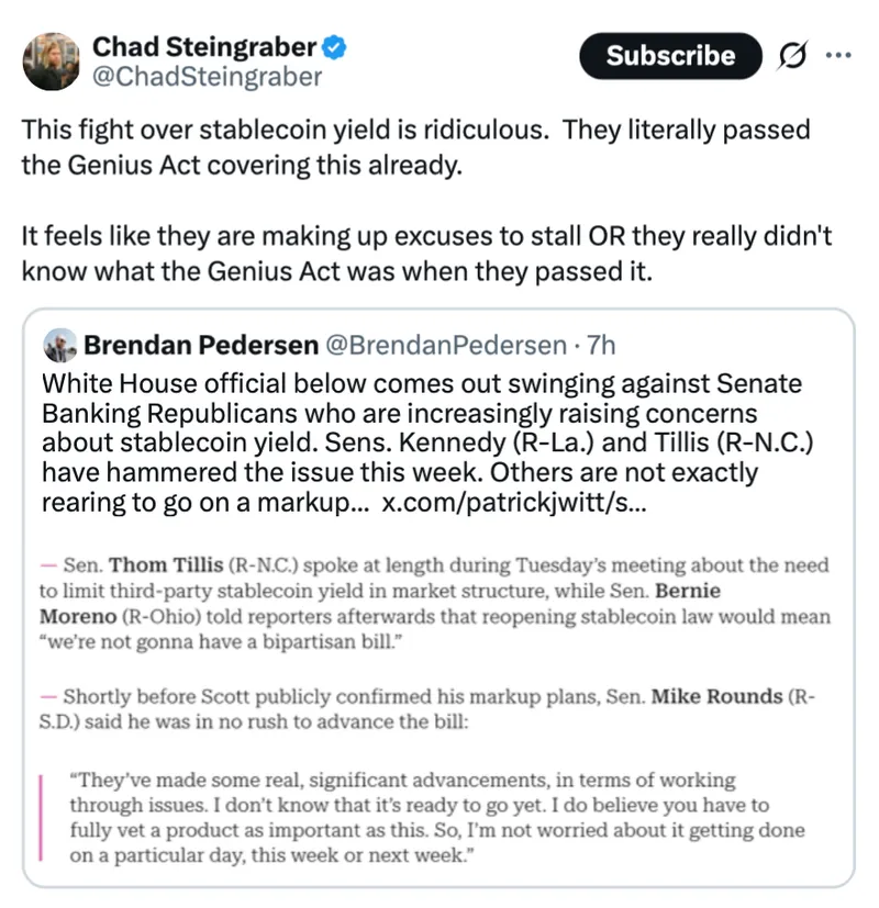 虽然《GENIUS Act》禁止稳定币发行方直接提供利息,但各大加密交易所仍通过其他方式奖励稳定币持有者。社区银行坚称,堵住这个"监管漏洞"对保护其放贷能力至关重要。