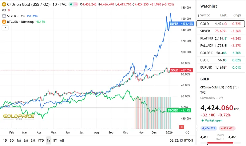 在过去一年中,这两种贵金属的表现均优于比特币,后者同期下跌约5%。黄金上涨67%,而银价在2025年飙升152%。截至发稿时,黄金报价为每盎司4424美元,白银报价高于每盎司75.60美元。