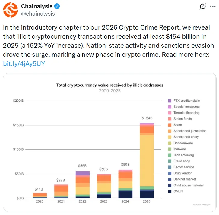 区块链分析公司Chainalysis在其2026年加密犯罪报告中指出,2025年与国家行为相关的链上交易量达到了前所未有的水平。