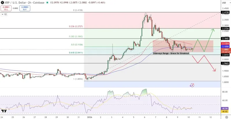 XRP价格预测显示中性,目前交易价格约为2.08美元,经过从2.27美元区间的急剧下跌后,价格已稳定。当前价格在2.13美元阻力位与2.04美元支撑位之间窄幅震荡,形成了通常预示重大波动的压缩带。