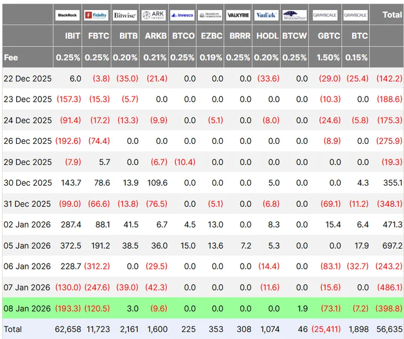 美国现货比特币交易所交易基金(ETF)需求出现明显逆转,新年首两个交易日净流入11亿美元后,ETF已连续三天记录资金外流,Farside Investors数据显示,周四累计流出3.98亿美元。
