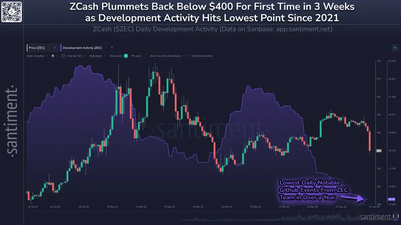 与Zcash相关的开发者活动显著下降,主要受到治理争议和持续价格下滑的压力影响。市场情报公司Santiment在周四的社交媒体帖子中指出,Zcash的开发者活动已降至2021年11月以来的最低水平,同时ZEC代币在过去两个月内下跌了约40%。
