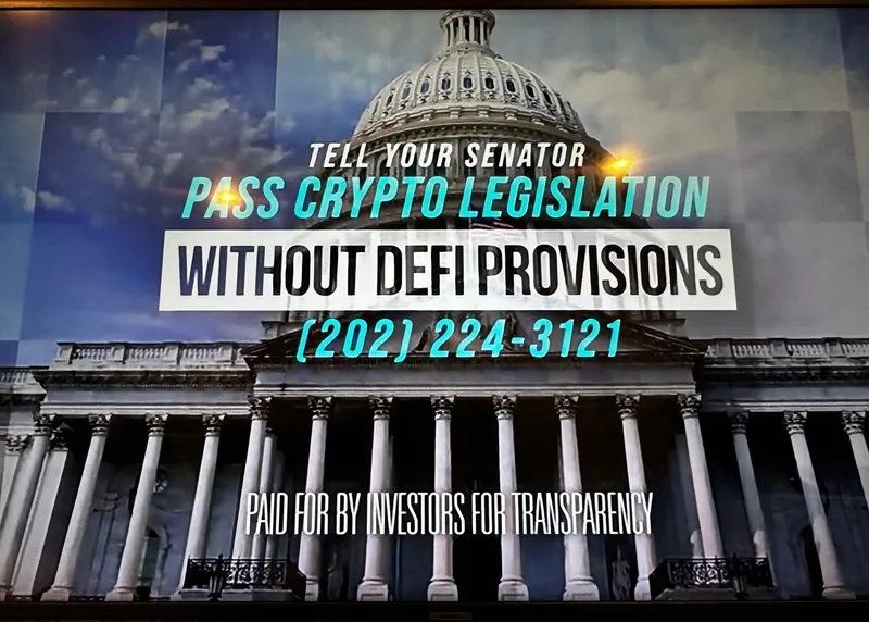 该团体的广告呼吁公众施压参议员,推动通过不包含DeFi条款的加密市场结构立法,认为DeFi对银行业构成威胁。根据加密货币美国频道主持人Eleanor Terrett分享的截图,透明投资者组织的成员提到:“致电您的参议员:通过不含DeFi条款的加密立法”,并提供了联系本地参议员的热线电话。