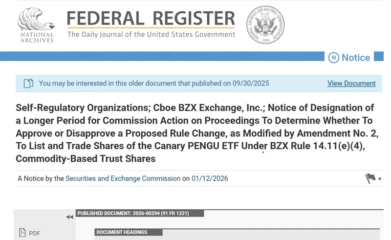 在通知中,SEC指定了更长的审议期限,以评估拟议的规则变更,这些变更将允许Canary的Pudgy Penguins(PENGU)ETF在Cboe BZX上市,以及T. Rowe Price主动型加密ETF在NYSE Arca上市。