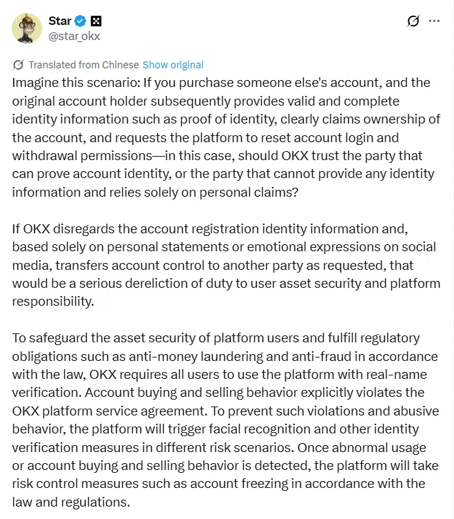 他强调:“OKX要求所有用户必须通过实名验证才能使用平台。买卖账户的行为显然违反了OKX平台服务协议。”