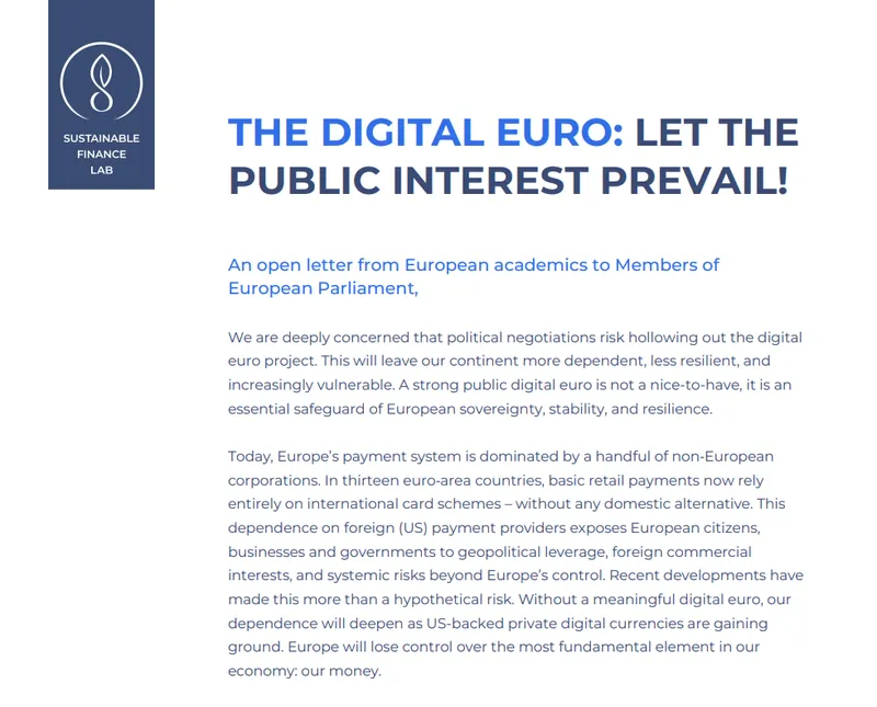 这封于周日发布的公开信,题为"数字欧元:让公共利益占主导!",警告称若缺乏强有力的公共选择,私人稳定币和外国支付巨头可能会在欧洲数字支付领域占据更大影响力。