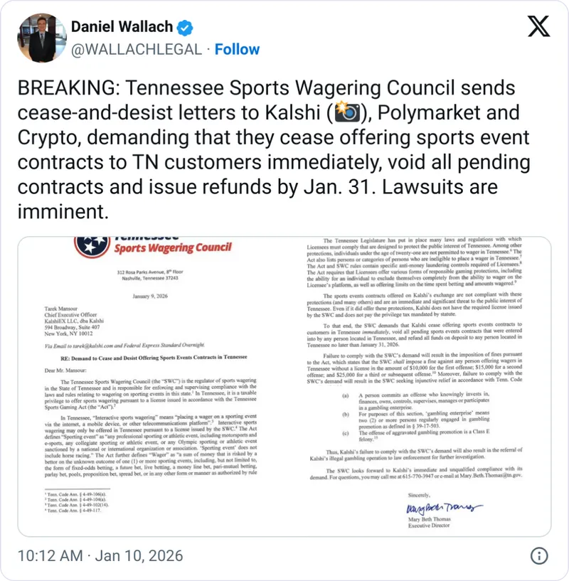 田纳西州体育博彩委员会上周五向Kalshi、Polymarket和Crypto.com发出了停止与终止函,要求它们停止在该州提供体育赛事合约。