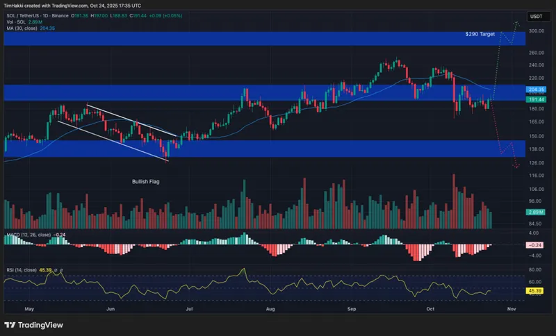 在今年1月达到250美元的峰值后,SOL在4月跌至100美元,目前交易价格接近191美元,显示出重新上涨的潜力。相对强弱指数(RSI)约为45,交易价格略低于30日移动平均线,表明该代币被低估。
