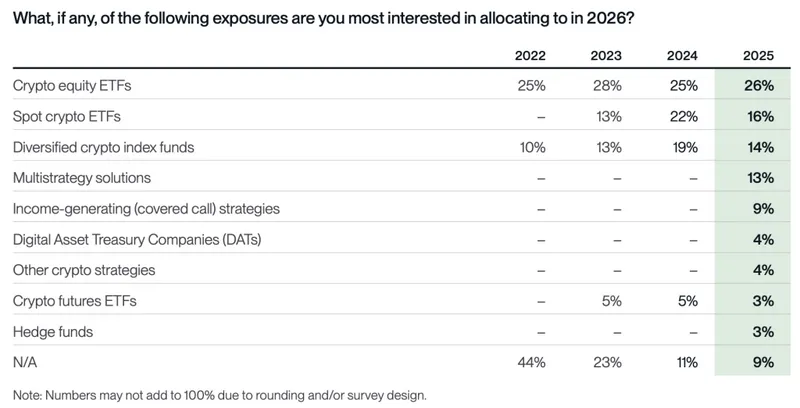产品偏好趋向于熟悉的投资形式。顾问们再次选择加密货币股票ETF作为2026年的首选投资,其次是现货加密货币ETF(16%)、多元化加密货币指数基金(14%)、多策略解决方案(13%)和收益生成策略(9%)。