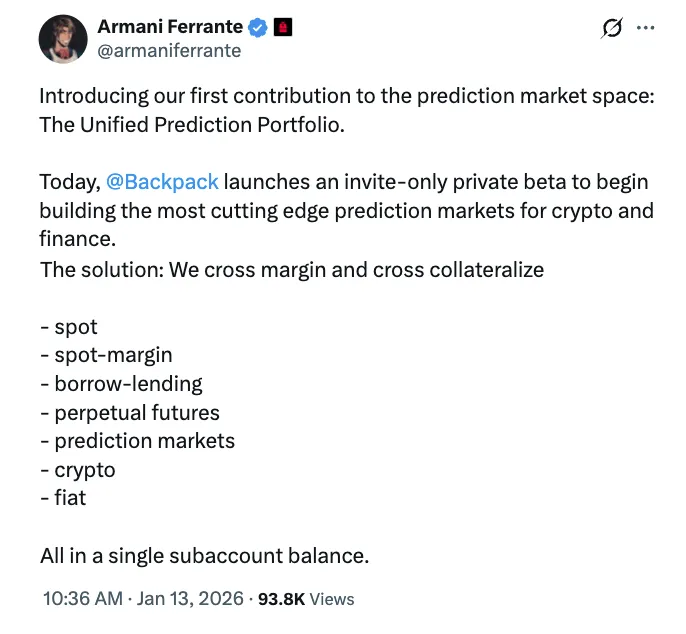 Backpack首席执行官Armani Ferrante在社交媒体上宣布,该交易所已启动新平台——统一预测组合的私人测试版。