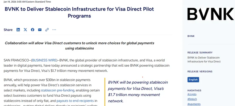 Visa正式选定英国的稳定币基础设施提供商BVNK,支持其新Visa Direct试点项目,该项目允许特定企业客户通过稳定币进行跨境支付,并直接将数字美元发送至接收者钱包。