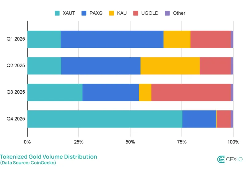年末交易激增主要由Tether Gold(XAUT)推动,该产品在第四季度占总交易量的75%,较第三季度的27%大幅上升。根据其官方网站数据,XAUT市值为24.2亿美元,由1,329根金条支持,约合16,239千克实物黄金。