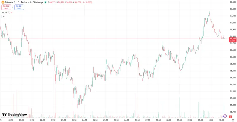 截至周四早间,比特币价格为97,053美元。今日开盘时最低为94,736美元,随后迅速上涨至97,704美元,目前维持在相似水平,偶有小幅回调。