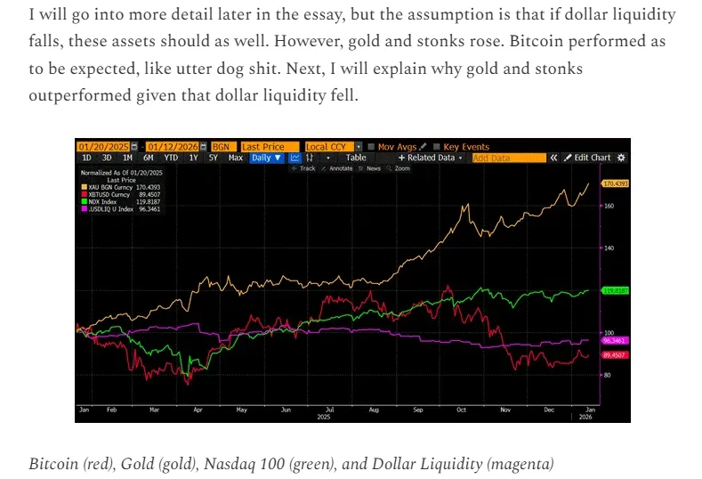 他认为,比特币在2025年因流动性问题而挣扎,而黄金和纳斯达克则持续上涨。他指出,“美元流动性必须扩展”,以便比特币能够超越其他资产。