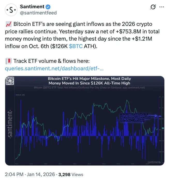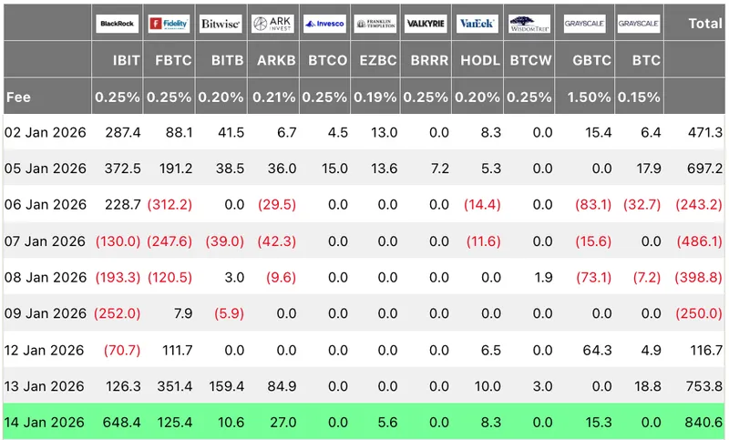 根据加密研究平台SoSoValue的数据,周三现货比特币ETF的资金流入达到了8.436亿美元,创下2026年以来的单日最大流入记录。