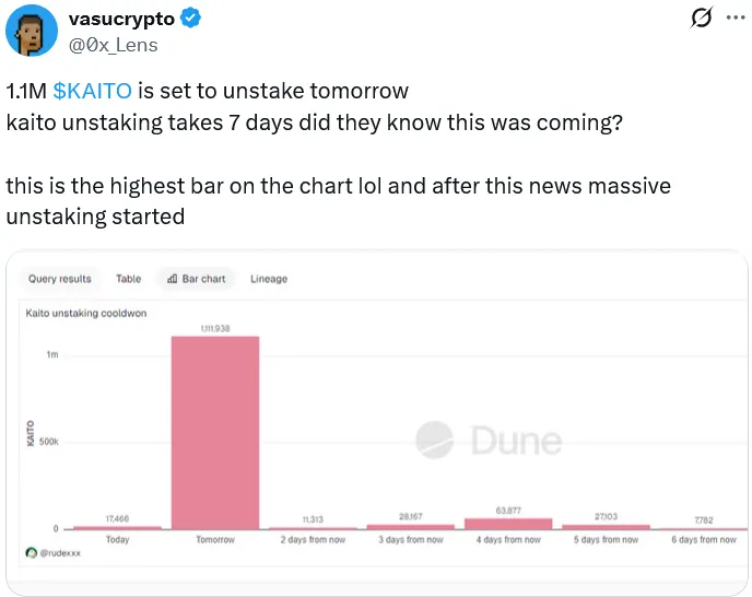X的禁令还引发了对部分KAITO质押者的质疑,认为他们可能在公司正式宣布前就已掌握相关消息。周五将有超过100万KAITO代币解质押,数量是平时的20到30倍。由于解质押周期为七天,一些加密分析师认为,这可能表明内部人员提前获得了禁令信息。