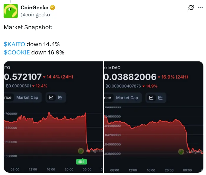 在Bier发布声明后不久,Kaito宣布将逐步关闭其奖励用户在X发布内容的“Yaps”产品,导致KAITO (KAITO) 代币出现大幅下跌。同时,Cookie DAO也表示其类似的“Snaps”产品将停止运营,使得COOKIE (COOKIE) 代币随之下跌。