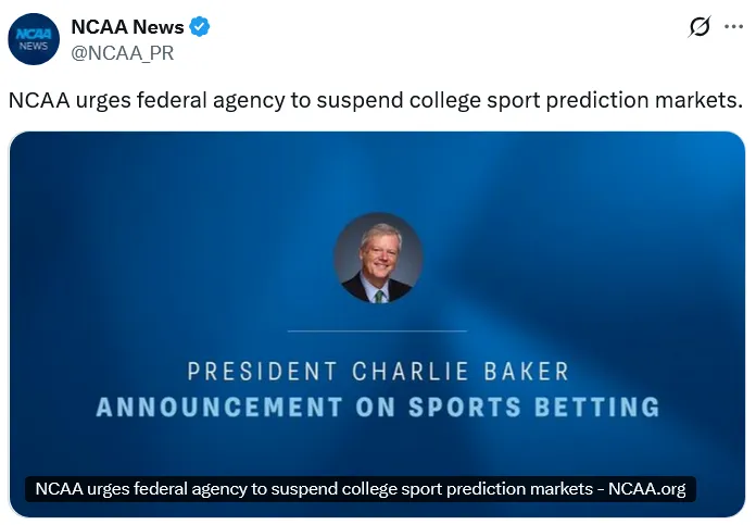 NCAA主席Charlie Baker在周三致信商品期货交易委员会主席Michael Selig,要求“暂停大学体育预测市场,直至建立更为完善的保障体系。”