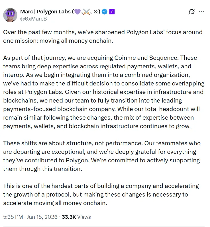 一位员工表示:“今天我在Polygon的时光画上句号——真是一次精彩旅程”;另一位则表示他们为Polygon感到骄傲与乐观,认为“现在是成为建设者的最佳时机”。