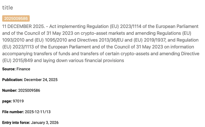 尽管MiCA框架已于2025年底在欧盟层面全面生效,但比利时直到最近才通过实施MiCA的国内法律。根据《比利时官方公报》,该成员国于2025年12月公布了相关实施法案,MiCA于2026年1月3日在比利时正式具备法律效力。