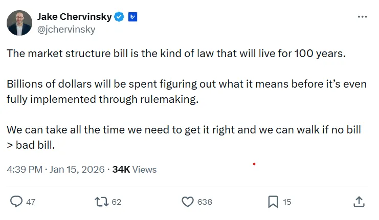 Coinbase首席执行官Brian Armstrong表示:“没有法案比糟糕的法案好。”Variant Fund首席法务官Jake Chervinsky指出,CLARITY是一种将“存活100年”的法律,“我们可以花一切必要时间把它做好。”