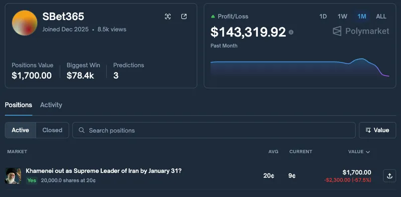 根据Lookonchain的分析,账户SBet365在两天前再次下注,预测伊朗最高领袖阿亚图拉·哈梅内伊将在1月31日前被罢黜。SBet365也是在Polymarket平台通过押注委内瑞拉局势获得丰厚回报的账户之一,赚取了约14万美元。