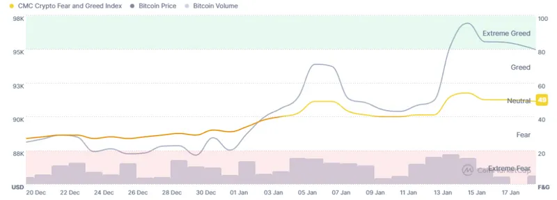 加密恐惧与贪婪指数在周五从50降至49,过去几天维持在49,处于中性区间。