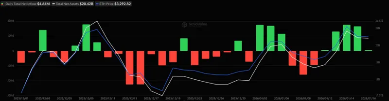 另一方面,美国以太坊ETF录得小额流入。1月16日,这些基金共流入464万美元。这是它们连续第五天的正流入,总净流入保持在129.1亿美元。