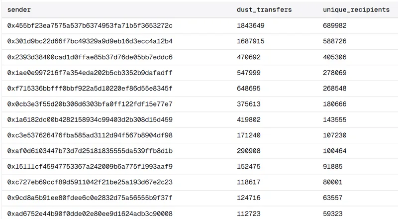 他仅关注向超过1万个地址发出交易的地址,以识别哪些属于“尘埃分发器”。“这些投毒地址随后向数百万潜在受害者分发尘埃,制造虚假交易记录。”