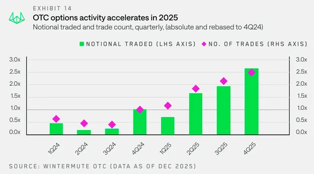 该公司的衍生品数据显示,期权活动同比增长超过一倍,系统化的收益和风险管理策略首次主导了流动,而非单一的方向性押注。
