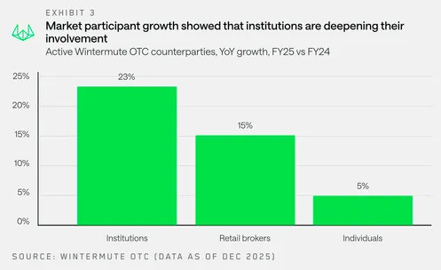 Wintermute发现,机构参与者的年增长率达到23%,包括加密基金、资产管理公司和传统金融机构。