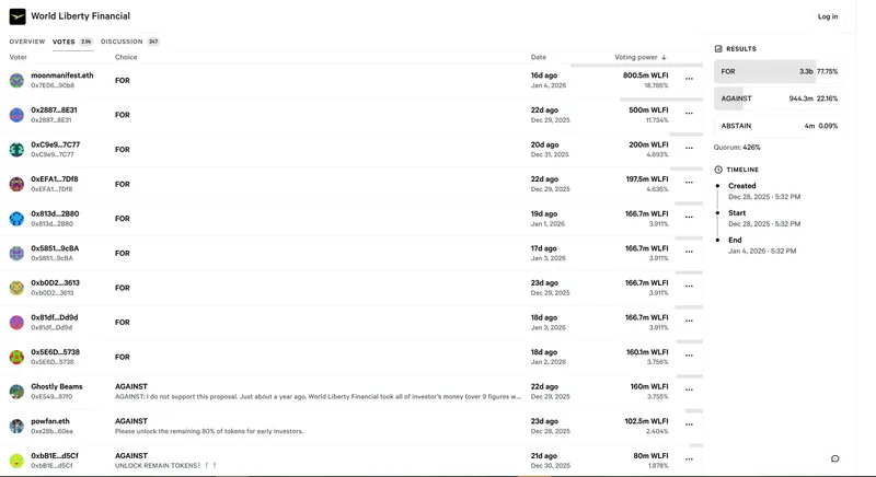 DeFi^2在社交平台上指出:“这与截图下方的真实投票者形成鲜明对比,这些投票者自代币生成事件(TGE)以来一直被锁定,无法访问他们的WLFI代币,且在团队允许之前无法对解锁进行投票。”