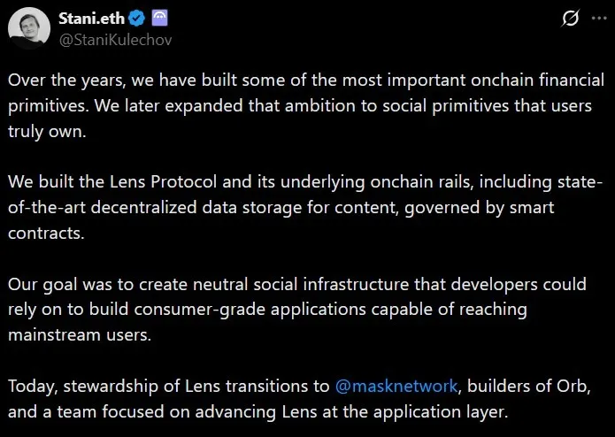 Lens 与 Aave 创始人 Stani Kulechov 的声明确认了这一变动。Kulechov 在社交媒体上表示,Aave 的角色将缩减为技术顾问,未来将重心重新放回 DeFi 领域。