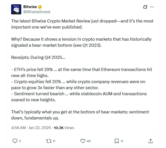 加密资产管理公司Bitwise在最新报告中表示,2025年第四季度可能会标志着当前加密货币熊市的结束。