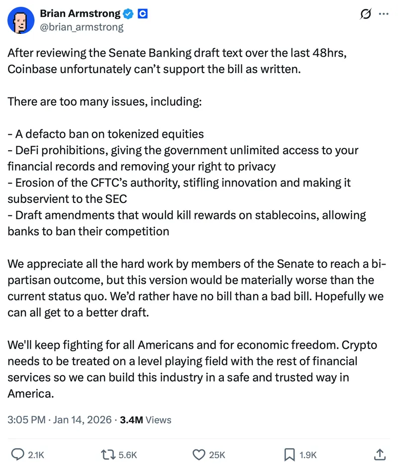 Coinbase首席执行官Brian Armstrong在社交媒体上表示,该法案草案存在“太多问题”,他不予支持,理由包括取消稳定币收益,并让银行免于竞争。